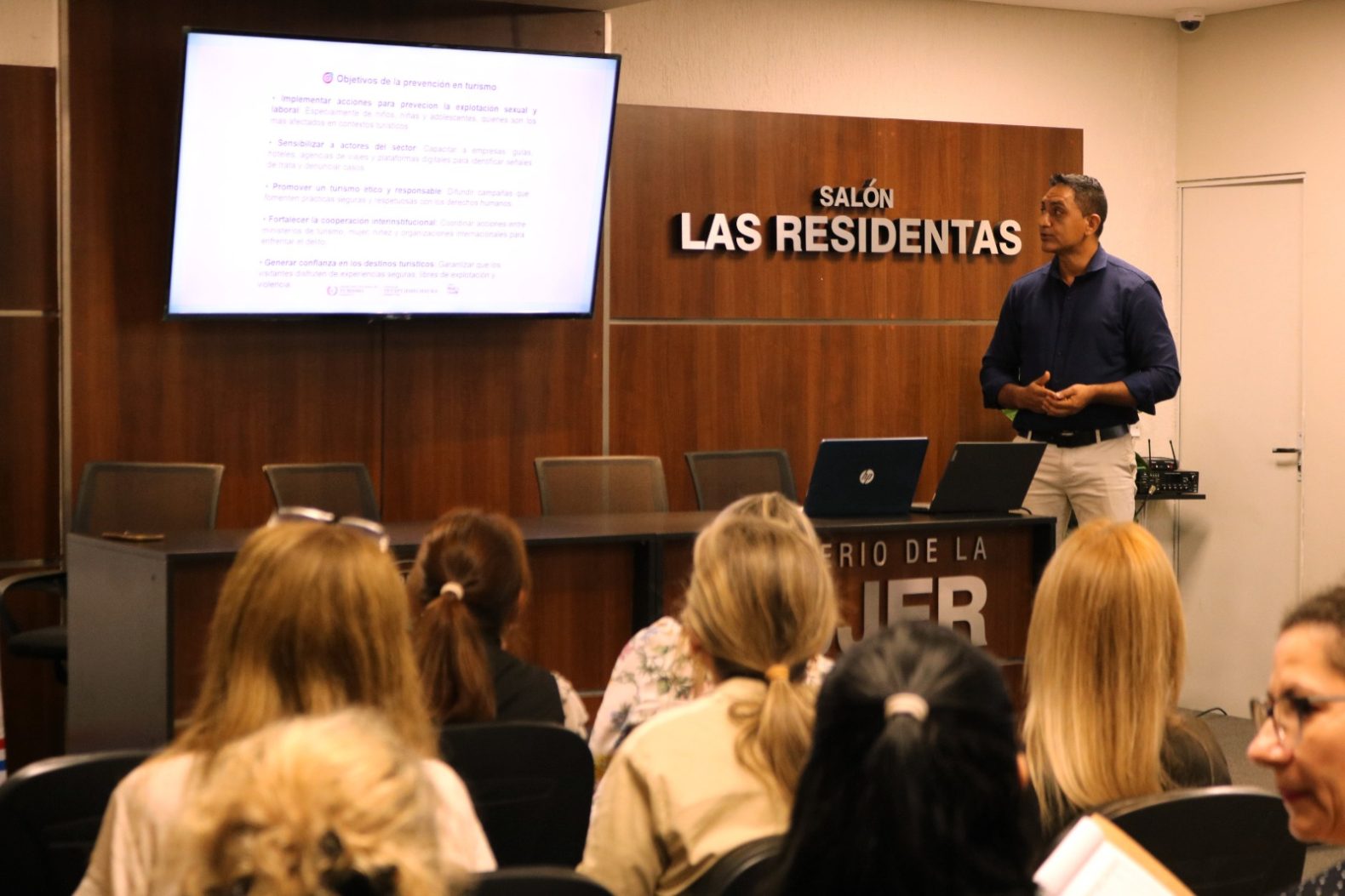 El Ministerio de la Mujer, en articulación con la Secretaría Nacional de Turismo (SENATUR), llevó a cabo una jornada de capacitación sobre prevención de la trata de personas y la explotación sexual de niñas, niños y adolescentes en el ámbito de viajes y turismo. La actividad se realizó el pasado viernes 20 de marzo de 2026, de 09:00 a 10:30 horas, en el Salón Auditorio Las Residentas de la institución, y estuvo dirigida a funcionarias y funcionarios de SENATUR.