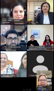Por el Ministerio de Relaciones Exteriores participaron la directora general, Belén Morra, la jefa de Género, Mujer e Inclusión Social de la Unidad General de DDHH, Mirta Benítez, y la funcionaria de la Dirección de Comercio Exterior e Inversiones, Andrea Martínez. Por el Ministerio de Industria y Comercio participó el funcionario del Viceministerio de MIPYMES, Carlos Giménez.
