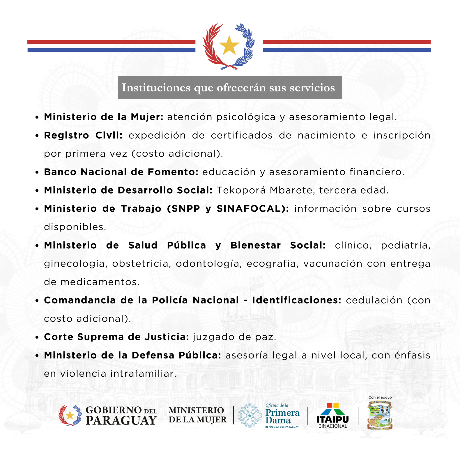 El Ministerio de la Mujer dará atención sicológica, asesoramiento legal; así como estarán también con sus respectivos servicios el Ministerio de Salud Pública y Bienestar Social, el Registro Civil del Ministerio de Justicia; Identificaciones de la Policía Nacional.