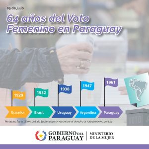 Paraguay fue el último país de Sudamérica en reconocer el derecho al voto femenino por ley, países como Ecuador (1929), Brasil (1932), Uruguay (1938) y Argentina (1947) fueron pioneros en reconocer el voto femenino.
