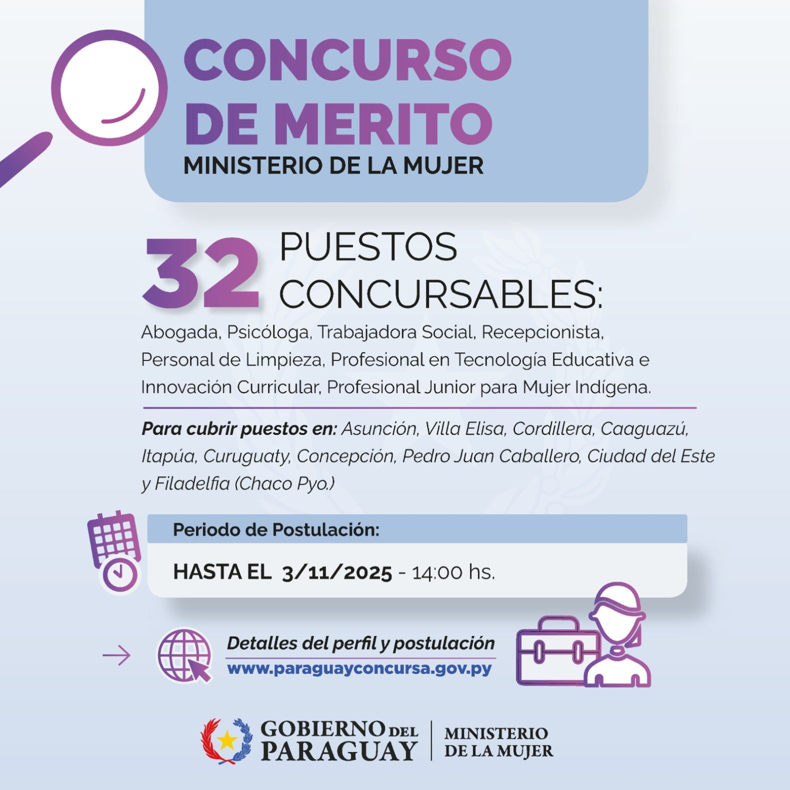 Los perfiles, requisitos y el proceso de postulación pueden consultarse en el portal oficial: www.paraguayconcursa.gov.py . Asimismo, los documentos requeridos deben presentarse de manera presencial en el piso 13 del Ministerio de la Mujer, en la Dirección de Desarrollo y Gestión del Talento Humano.