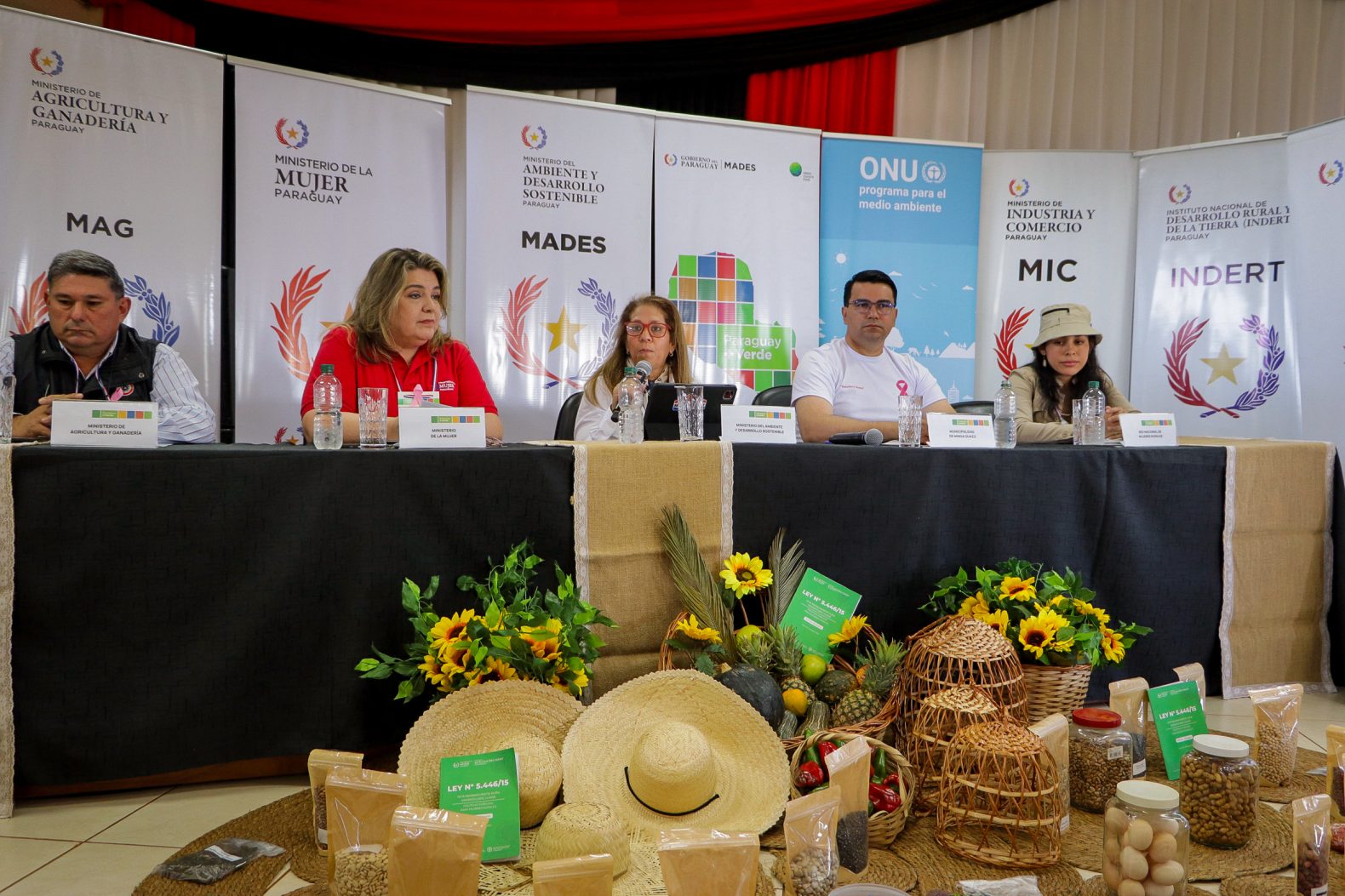 La apertura del encuentro desarrolló la viceministra de Igualdad y No Discriminación del Ministerio de la Mujer, Sonia Brucke; el intendente de la Municipalidad de Minga Guazú, Diego Ríos, la presidenta de la Red Nacional de Mujeres Rurales del Paraguay, Librada Torales; el gerente del Ministerio de Agricultura y Ganadería, Darío Mascareño; y la directora de MADES, Lilian Portillo.