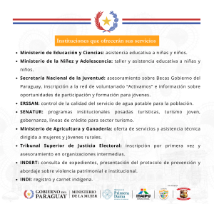 El Ministerio de la Mujer brindará servicios de atención psicológica y asesoramiento legal; así como el Ministerio de Salud Pública y Bienestar Social; el Registro Civil del Ministerio de Justicia; Identificaciones de la Policía Nacional, el Ministerio de Desarrollo Social acercarán servicios de sus respectivas áreas.