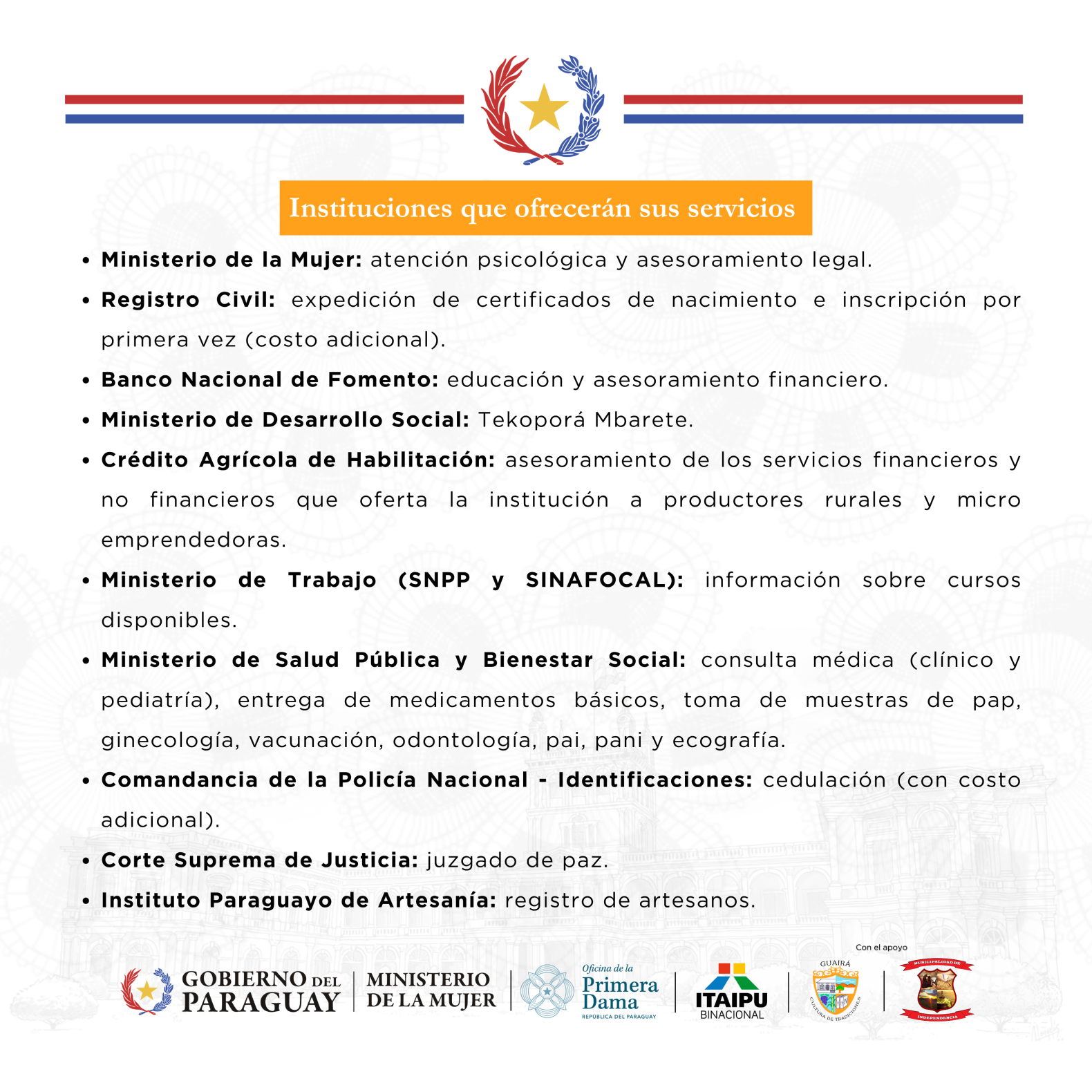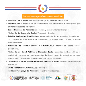 El Ministerio de la Mujer brindará servicios de atención psicológica y asesoramiento legal; así como el Ministerio de Salud Pública y Bienestar Social; el Registro Civil del Ministerio de Justicia; Identificaciones de la Policía Nacional, el Ministerio de Desarrollo Social acercarán servicios de sus respectivas áreas.