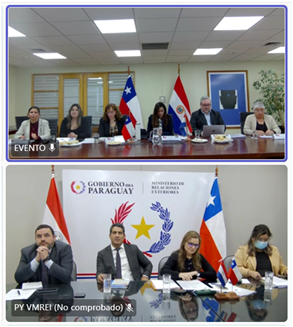 El encuentro virtual contó también con la participación de los embajadores de Paraguay, Antonio Rivas y de Chile, Francisco Gramez, así como de autoridades técnicas de ambas delegaciones. En representación del Ministerio de la Mujer de Paraguay participaron las directoras generales Ana Pavón y Zunilda Pereira, junto con las directoras Vanessa Valleau y María Gloria Báez.