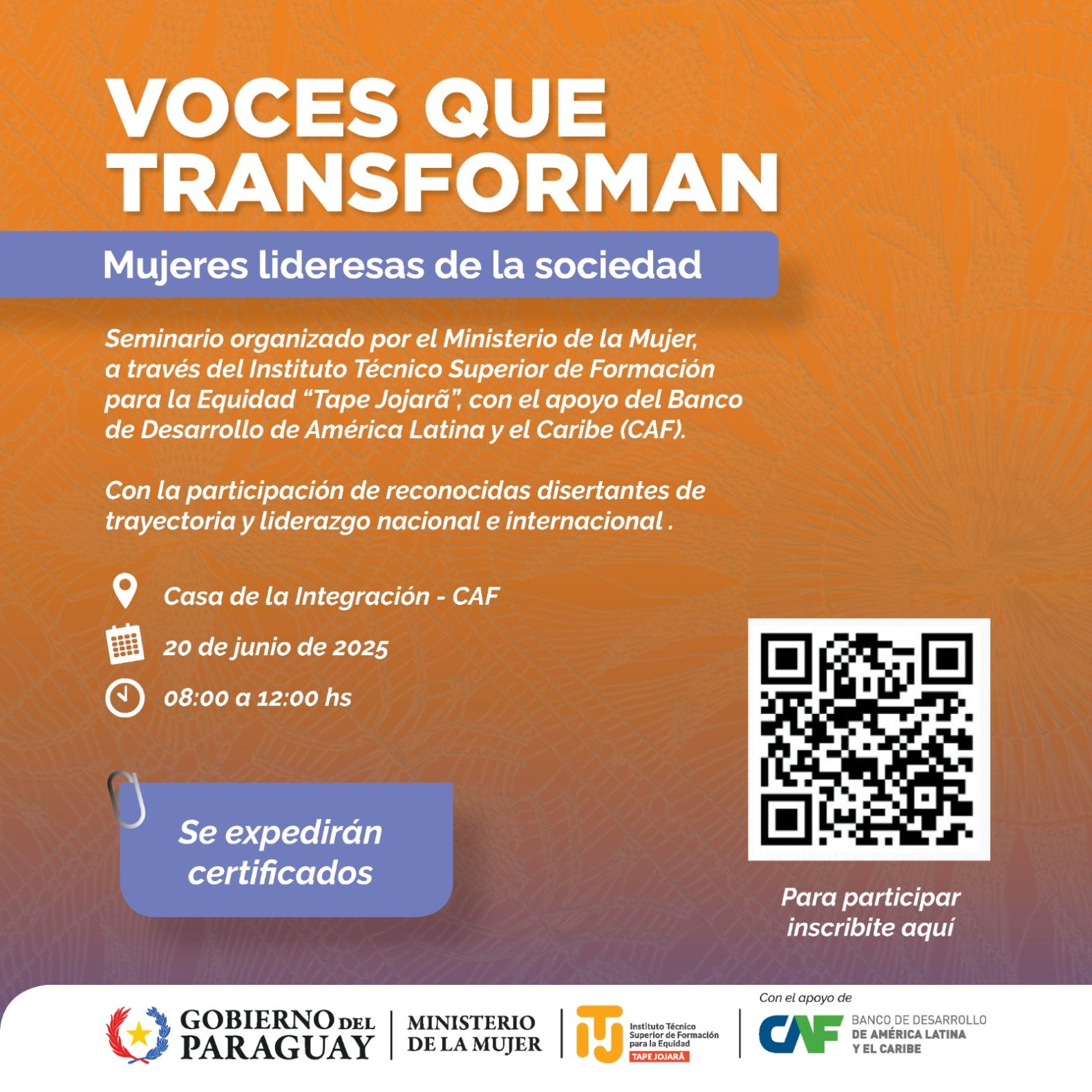 El Ministerio de la Mujer, a través del Instituto Técnico Superior de Formación para la Equidad «Tape Jojarã», con apoyo del Banco de Desarrollo de América Latina y el Caribe (CAF) organiza el seminario “Voces que transforman: mujeres lideresas de la sociedad”. El encuentro será el próximo 20 de junio, en la Casa de la Integración de la CAF, de 08:00 a 12:00 horas.